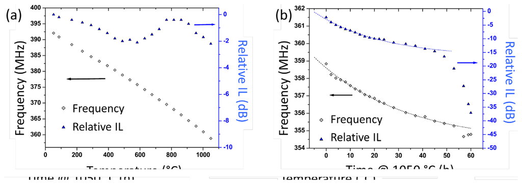 Aubert et al. studied a surface acoustic wave delay lines using AlN/sapphire structure and iridium interdigital transducers for high-temperature applications up to 1,050 °C [68]. The sputtering method was used to fabricate AlN thin films on sapphire substrates. Interdigital transducers were fabricated using iridium (Ir) films as electrodes and titanium (Ti) as an adhesion layer by e-beam evaporation. Photolithography and ion beam etching were used to obtain SAW delay lines. For the high-temperature tests setup, SAW devices were bonded with Pt wires to platinum foil strips and placed inside the furnace. The fabricated SAW sensor was characterized at temperatures up to 1,050 °C under vacuum conditions. The sensor exhibited a large and quasi-linear sensitivity to the tested temperature with a fairly constant insertion loss (IL) as shown in Figure 10a. During the long-term stability test, a significant oxidation of the AlN film was observed, which was a reason of increased IL and the frequency drift after 60 h at 1,050 °C, as can be seen in Figure 10b. Nevertheless, the test results suggest a great potential of AlN-based SAW devices for high-temperature applications at temperatures up to 1,000 °C.