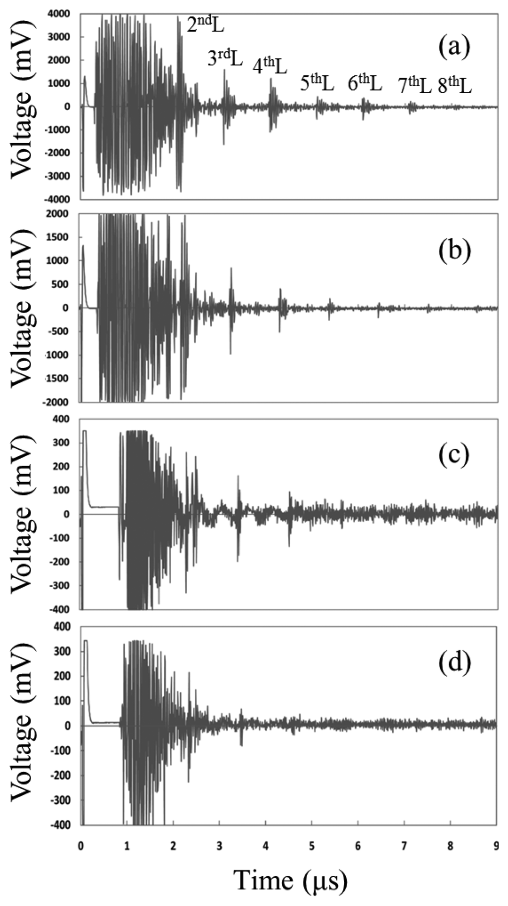 Acoustic emissions (AE) are transient elastic waves (100 kHz–1 MHz) which are spontaneously generated by dynamic stress in a structure. As cracks occur or grow in a material body, the elastic energy is released and AE is produced as a result of this failure mechanism. AE sensing techniques using AE sensors are one of the most popular non-destructive inspection techniques [86]. Acoustic emission sensors are usually attached to the surface of testing materials and used to detect the change in the amplitude of elastic waves induced by growing cracks or mechanical failure in structures [87]. From the data obtained using AE sensors, the condition of the target material and the defect location can be monitored continuously. Piezoelectric AE sensors are widely used for various applications due to their low profile. Low profile PE AE sensors can be mounted on the surface of the structure or embedded within the structure directly, improving their response and resistance to environmental effects [86]. High-temperature non-destructive inspection techniques are frequently required for particular applications such as the nuclear power industry. In nuclear power plants, it is important to detect any leaks in valves and pipes as well as the presence of intergranular stress corrosion cracking (IGSCC) [88–90]. The IGSCC problem, for example, is a serious safety issue but also entails the restoration cost which can be in the billions of dollars [91]. Thus, crack growth should be detected instantaneously using a highly sensitive leak and crack detection technique in order to prevent any through-wall cracks in the system at high-temperatures [91]. AE offers promising benefits for this purpose since AE method is an integral method permitting continuous, on-line, and real time monitoring method [92]. For these reasons, piezoelectric acoustic emission sensing techniques for high-temperature applications without using cooling systems or buffer rods have been intensively researched [87].