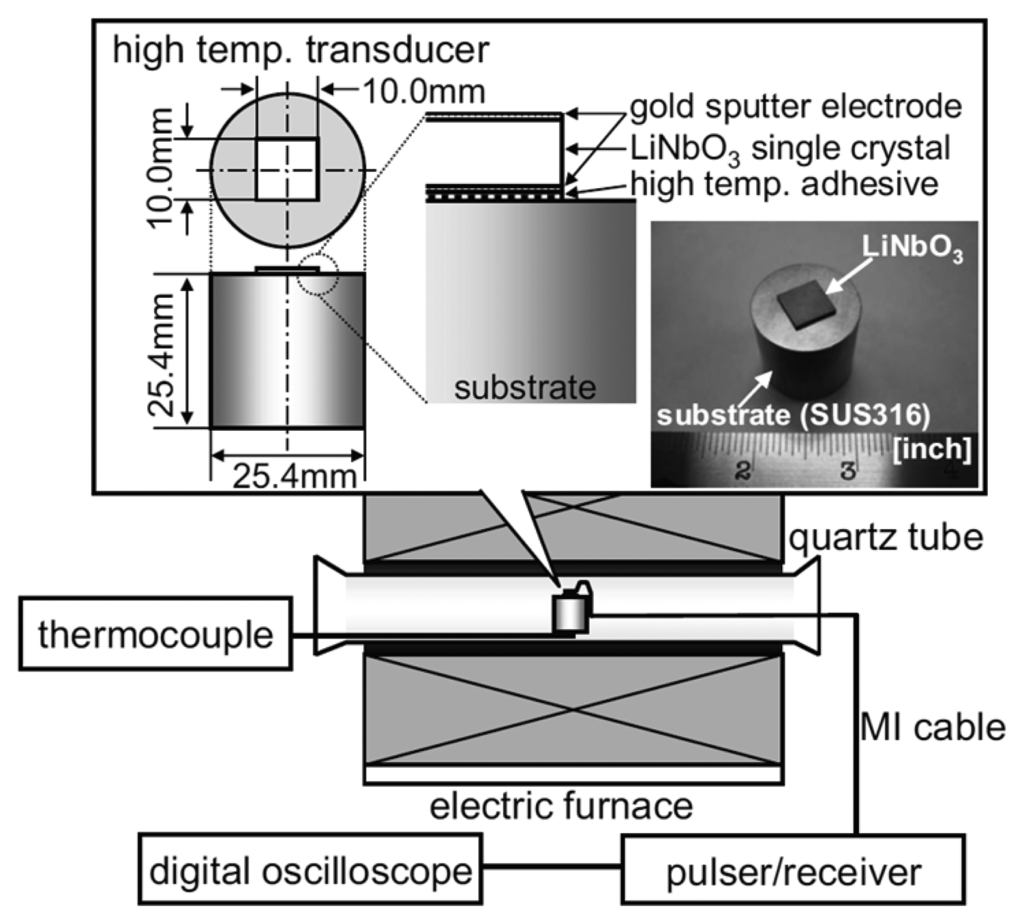 - Baba, A.; Searfass, C.T.; Tittmann, B.R. High-temperature ultrasonic transducer up to 1000° C using lithium niobate single crystal. Appl. Phys. Lett. 2010, 97. [Google Scholar] [CrossRef]