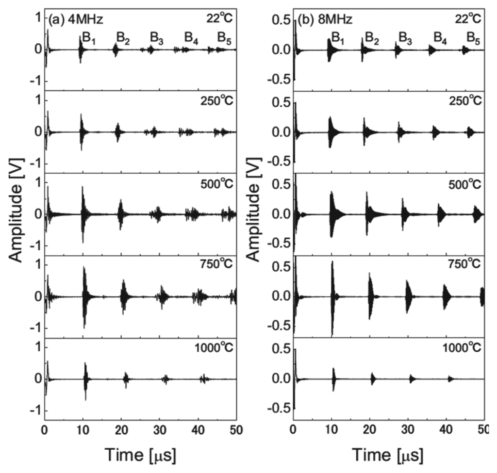 Bada et al. have developed a high-temperature ultrasound transducer using lithium niobate (LiNbO3) single crystals [84]. A stainless steel was chosen as a substrate due to its similar thermal expansion coefficient to LiNbO3. The 8 MHz and 4 MHz crystal elements were prepared and bonded onto the substrate using high-temperature adhesive as shown in Figure 12. A high-temperature mineral insulated (MI) cable and silver paste were used for the electrical connection. Allowable temperature limits of all materials were higher than 1,000 °C except for the silver paste. The pulse-echo tests were conducted with the fabricated 8 MHz and 4 MHz ultrasound transducers in a furnace at temperatures up to 1,000 °C. For both transducers the stable multiple echoes were observed from the stainless steel substrate at tested temperatures as can be seen in Figure 13. The transducer failure due to the oxygen loss or the resistance change was not observed during the high-temperature experiments. The test results show that the LiNbO3 single crystals can be used for high-temperature ultrasound transducer up to 1,000 °C. These high-temperature results differ from previously reported limitations of 600 °C. This may be due to the temperature dependence of crystal's resistivity [22]. The resistivity of the LiNbO3 crystal decreases as operating temperature increases. Decreased resistivity leads to the increased lower limiting frequency (fLL) of the transducer, since fLL is inversely proportional to the RC time constant (i.e., , where K is dielectric constant and ρ is resistivity) [21]. Thus, this low resistivity can limit the use of LiNbO3 crystal at high-temperature (>600 °C) as a low frequency device, but has minimal impact on high frequency devices.