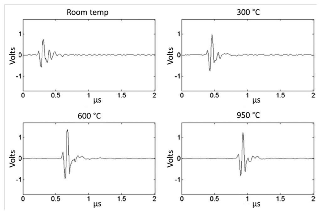 Recently, Parks et al. have studied three different high-temperature piezoelectric materials including YCa4O(BO3)3, LiNbO3, and AlN for HT ultrasound transducer applications [85]. Figure 14 shows a photograph of the ultrasound transducer and fixture assembly. A wave spring was used to compress the piezoelectric material onto the ultrasonic propagation medium. Good repeatability (20 times) and longevity (several days) at temperatures below 560 °C were observed with 150 psi of pressure provided by the spring. The echo amplitude was recorded in the long-term in situ test for 55 h at 550 °C. It was found that the smaller variation was observed from AlN and YCOB transducers, compared to lithium niobate transducers. It was also revealed that the use of Al foil as a backing material instead of carbon-carbon can improve the transducer performance without the loss of mass or volume at elevated temperatures. In thermal ratcheting tests, each transducer's pulse—echo performance was evaluated with the heat treatments at 950 °C for 24 h and 1,000 °C for 48 h. All three materials exhibited stability in ultrasonic performance but only the YCOB crystal exhibited a much less pronounced change in dielectric properties after heat treatment. The YCOB transducer (using silver foil as the couplant) also showed the stable pulse-echo response from the in situ test at temperatures up to 950 °C as shown in Figure 15, which indicates that the YCOB crystals can be promising materials for high-temperature ultrasound transducer applications.