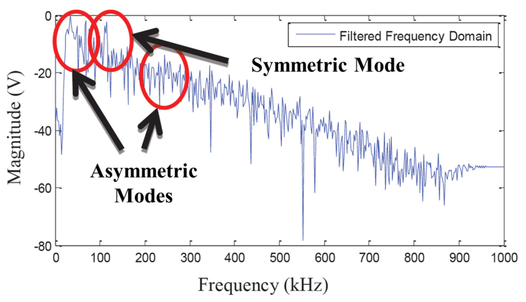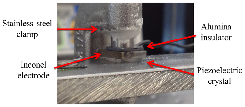 Recently, Johnson et al. have investigated a piezoelectric acoustic emission sensor using YCOB single crystal for use in high-temperature applications [94]. A YCOB crystal was in contact with a stainless steel bar and clamped with an alumina insulator pad using a stainless steel clamp as shown in Figure 16. An Inconel plate was used for the top electrode and Inconel wires were used for electrical connection of the sensor. The sensor was placed inside of a horizontal tube furnace and tested at temperatures up to 1,000 °C. An acoustic emission induced by a Hsu-Nielsen method propagated through the stainless steel bar into a furnace where the sensor was placed. Figure 17 shows the voltage output of the YCOB sensor as a function of frequency at 1,000 °C. It was found that the fabricated acoustic emission sensor was able to detect zero order lamb wave modes and the first order anti-symmetric wave mode successfully at temperatures up to 1,000 °C. No degradation of the sensor performance was observed during the high-temperature tests. The results of this study support the feasibility of YCOB single crystals as acoustic emission sensor materials for high-temperature applications.