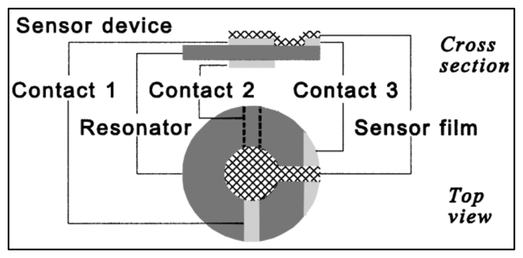 Gas sensors present value in many applications, especially high-temperature combustion processes. Piezoelectric gas sensors can be created by means of microbalances with deposited layers of film that selectively absorbs gas molecules. Shifts in the resonant frequency of the device are accompanied by the changes in mass, which can be quantitatively related. Quartz crystal microbalances (QCMs) are commonly used due to their low cost, but are limited to the operating temperature of quartz, ∼350 °C. Research on developing a high-temperature gas sensor using this structure has been conducted, using a langasite LGS crystal and TiO2 film for an oxygen selective gas sensor [30,95]. The sensor schematic is shown in Figure 18, with references to the 780 μm thick LGS resonator, platinum electrodes, and the O2 sensitive TiO2 film.