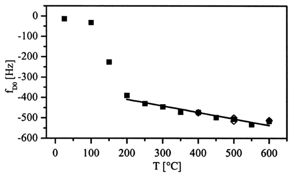Figure 19 shows the frequency drop (fD0) of TiO2 film coated LGS gas sensor resulted from the atmospheric condition change (O2 to 6% H2/Ar) with increasing temperatures. It was observed that the prototype nanobalance gas sensor was able to detect O2 gas effectively at temperatures up to at least 600 °C. The temperature dependence of the sensor was accounted for, and reference nanobalance sensors were used to reduce the temperature sensitivity [30].