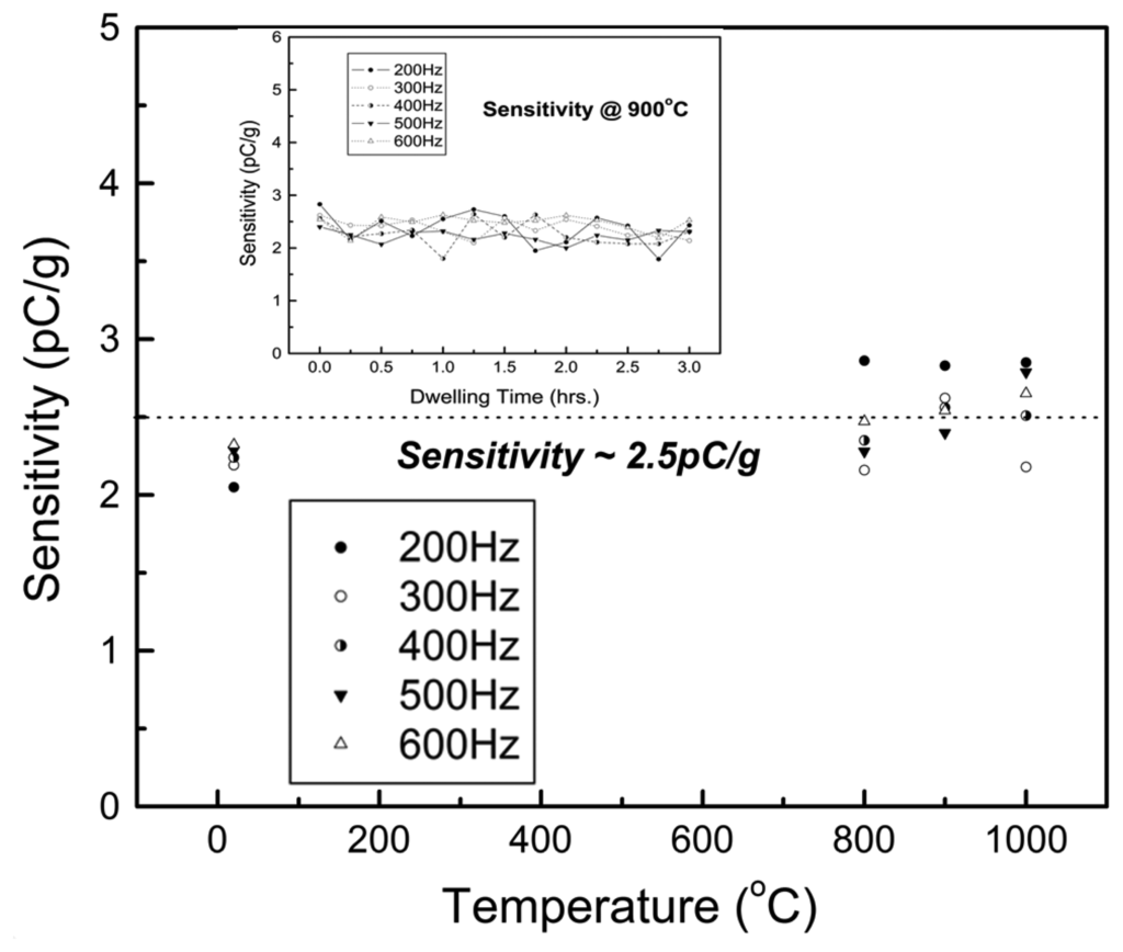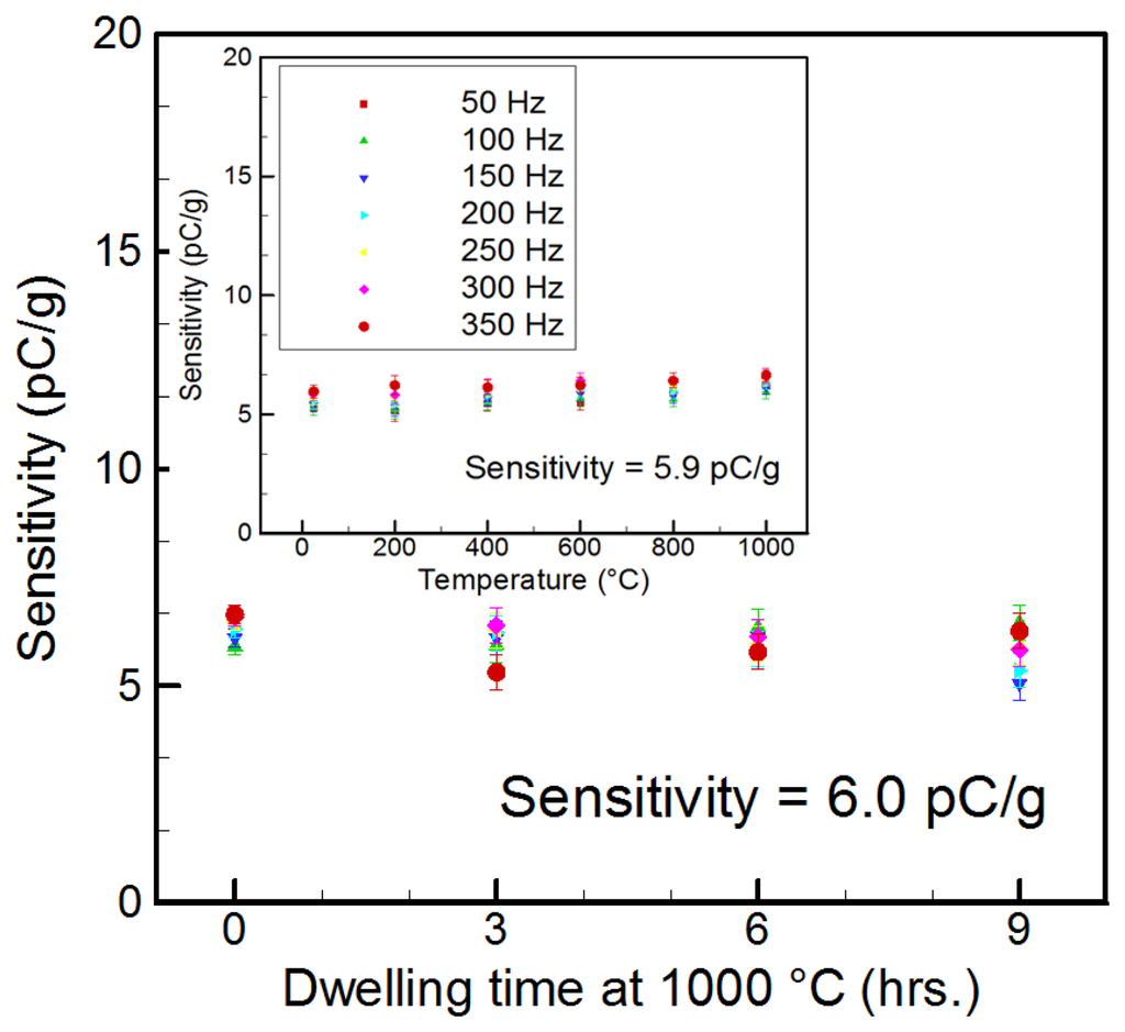Figure 4 shows the measured sensitivity of the shear mode accelerometer with increasing temperature (25–1,000 °C) at the tested frequency range (50–350 Hz). The highly stable sensitivity of 5.9 ± 0.06 pC/g was observed throughout the tested frequency and temperature range. From the 9-hour dwell time test, the long-term stable sensitivity (6.0 ± 0.12 pC/g) at 1,000 °C was also obtained as can be seen in the inset in Figure 4.