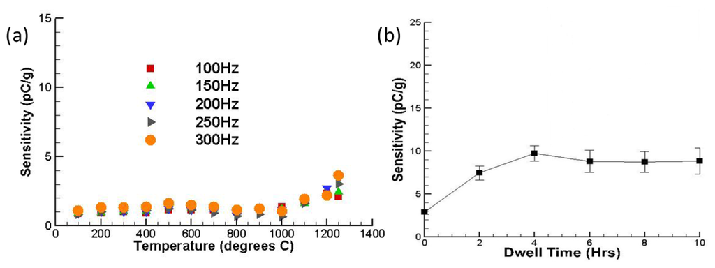 More recently, further studies of piezoelectric accelerometers using YCOB crystals for higher temperatures (≈1,300 °C) have been conducted by Salazar et al. [59]. A similar design including the shear mode type and electrode-less structure was used for the prototyped accelerometer. Accelerometer sensitivities were measured at increasing temperatures up to 1,250 °C. The excellent stability up to 1,000 °C as previously reported for YCOB sensors was obtained. The differences in reported sensitivity come from testing the YCOB crystals and Inconel parts multiple times, affecting both materials' properties. YCOB crystals of different sizes were used for each test as well, which would have a different corresponding capacitance. Figure 5a shows the sensor sensitivity at increasing temperatures with different frequencies. As the temperature was increased beyond 1,000 °C, a gradual and steady increase in sensor sensitivity (≈2.92 ± 0.56 pC/g at 1,250 °C) was observed. The sensitivity of the accelerometer was also measured during a 10 h dwell test. After two hours of testing, the sensitivity of the accelerometer reached a quasi-steady state (≈8.7 ± 1.63 pC/g), which indicated that the prototyped accelerometer can operate reliably at 1,250 °C as shown in Figure 5b. This increase and plateau in the accelerometer sensitivity with increasing temperature may be due to the seismic masses and center post softening at high-temperatures, allowing for a better contact surface, which would increase charge transfer efficiency.