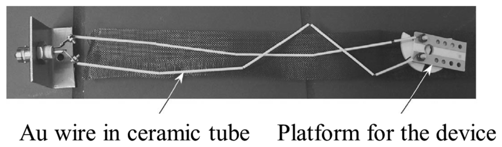 Hamidon et al. have developed a high-temperature surface acoustic wave device using gallium orthophosphate (GaPO4) with operating frequency of 434 MHz and temperatures up to 600 °C [65]. Interdigital transducers (IDTs) were fabricated using an e-beam lithography coupled with a lift-off technique on the GaPO4 crystal plate. Platinum (Pt) was used for the electrode due to its high melting temperature (1,768.3 °C), high resistance to oxidation and almost constant bulk resistance temperature coefficient. Titanium (Ti) or zirconium (Zr) was chosen as an adhesion layer. The sensor was bonded using Pt wire and attached to a stainless steel substrate for high-temperature tests as can be seen in Figure 6.
