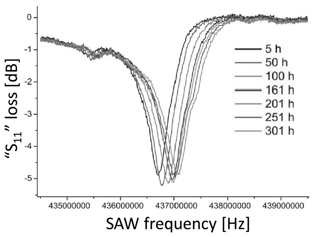 The sensor performance and long-term stability was investigated. The S11 parameters which indicates the sensor performance was measured as a function of frequency at 600 °C for 301 h. The stable S11 loss curve with a frequency shift in a positive direction was obtained as shown in Figure 7. The oxidation at 600 °C was not observed. The prototyped sensor showed the stable performance for more than 3,500 h with high quality factor (3,000–3,500). The results support the use of the developed device as a wireless SAW sensor for high-temperature applications up to 600 °C.