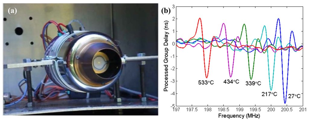 In addition, SAW sensors were also tested using the integrally bladed rotor (IBR) of a JetCat turbine engine with temperature up to 750 °C and centripetal acceleration up to 53,000 g's. Wireless SAW sensors were interrogated on the IBR using inductive coupling antennas (Figure 9a) and the temperature-frequency response of SAW sensors was successfully recorded for temperature monitoring of the rotating part (Figure 9b). These results suggest a great diversity of the use of HT SAW wireless sensor for harsh-environmental applications such as aerospace, energy industries and other harsh-environment industrial processes.