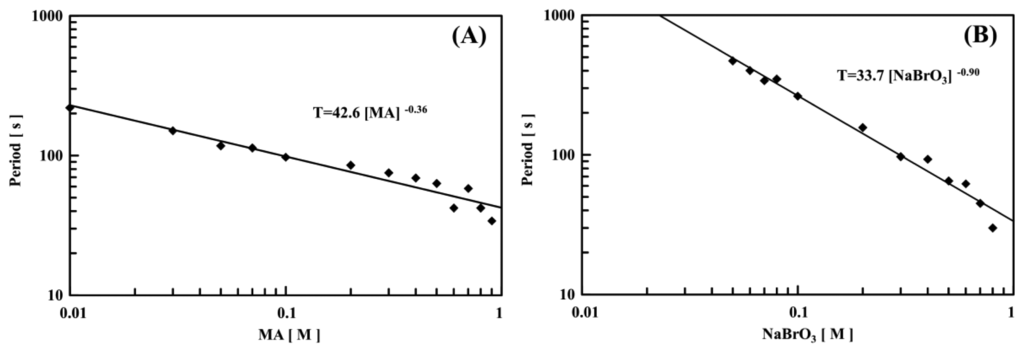 Figures 6 and 7 show logarithmic plots of the period against the initial concentration of one substrate, with fixed concentrations of the other two BZ substrates at a constant temperature (T = 18 °C). As shown in Figures 6 and 7, all the logarithmic plots exhibited good linear relationships. The period, T (s), of the self-oscillation can be expressed as a[substrate]b, where a and b are experimental constants and the brackets denote initial concentration. When the concentrations of NaBrO3 and MA were altered, the b values were almost the same as compared to the two types of the polymer chains. In contrast, as shown in Figures 6C and 7C, the b value of poly(NIPAAm-co-Ru(bpy)3) was smaller than that of poly(NIPAAm-co-Ru(bpy)3-co-AMPS). This result indicated that the concentration of H+ could increase the period of the optical self-oscillation for the poly(NIPAAm-co-Ru(bpy)3) as compared to the poly(NIPAAm-co-Ru(bpy)3-co-AMPS). We considered that this effect was related to the strongly acidic AMPS domain in the self-oscillating polymer chain. In addition, as shown in Figures 6C and 7C, the periods have different characteristics as compared with those of the conventional poly(NIPAAm-co-Ru(bpy)3) gels [34]. In the case of a poly[NIPAAm-co-Ru(bpy)3] gel, the period increases with increasing HNO3 concentration. In general, the self-oscillation period decreases with increased initial concentrations of the BZ substrates because of the increase in the collision frequency among the BZ substrates. Under these experimental conditions, therefore, as the initial concentration of nitric acid increased, the periods of the two types of polymer chains decreased.