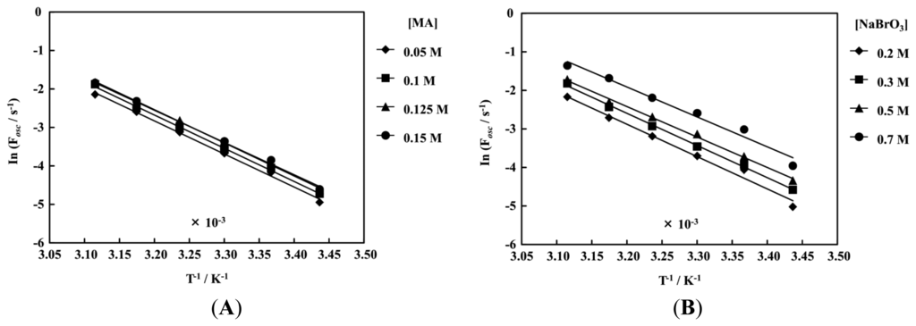 Figures 8 and 9 show the Arrhenius dependence on the temperature at a fixed concentration of the other two BZ substrates. The measurements of the poly(NIPAAm-co-Ru(bpy)3-co-AMPS) and poly(NIPAAm-co-Ru(bpy)3) were conducted in the temperature ranges of 18–48 °C and 18–30 °C, respectively. In the case of the poly(NIPAAm-co-Ru(bpy)3), the self-oscillating behavior could not be measured at 36 °C above. This is because the LCST in the oxidized state was 36 °C. Therefore, above 36 °C the poly(NIPAAm-co-Ru(bpy)3) aggregated in the reduced and oxidized state, and the self-oscillation did not occur. As shown in Figures 8 and 9, all plots have a linear relationship, that is, the effect of the temperature on the period followed the same trend. In addition, it was clarified that the activation energies of the self-oscillation was hardly affected by the initial concentration of the three BZ substrates as shown in Figures 8D and 9D. Moreover, activation energies of the two self-oscillating polymer chains were almost the same value as the normal BZ reaction, i.e., not including the self-oscillating polymer system with the Ru moiety [35]. These results suggested that the polymer chain covalently bonded to the Ru(bpy)3 did not inhibit the reaction when poly(NIPAAm-co-Ru(bpy)3-co-AMPS) and poly(NIPAAm-co-Ru(bpy)3) were utilized.