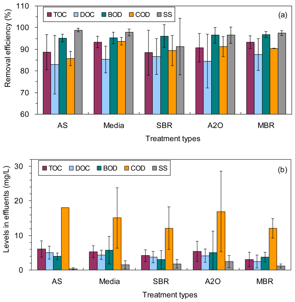 The TOC, DOC, BOD, COD and SS removal efficiencies were not statistically distinguished among the five different treatment types (ANOVA, p > 0.05), except for the lower removal efficiency of COD using the AS treatment than using the Media treatment (86% ± 3% vs. 94% ± 2%, Table 1; ANOVA, p = 0.04). The levels of TOC, DOC, BOD, COD and SS in the effluents showed no significant difference among the five different treatment types (ANOVA, p > 0.05; Figure 1b).