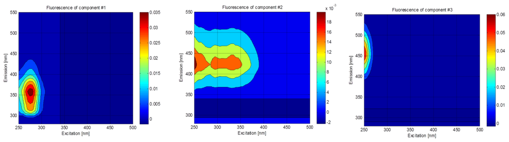PARAFAC modeling was performed using MATLAB 7.0 (Mathworks, Natick, MA, USA) with DOMFluor toolbox ( http://www.models.life.ku.dk) [27]. The number of components was determined based on three diagnostic tools including core consistency, visual inspection of spectral shapes of each component, and split-half validation [27]. The components extracted by PARAFAC represent fluorescence groups that exhibit similar fluorescence properties. The fluorescence intensities of the individual components (i.e., Fmax of C1, C2, and C3), after the dilution factors of the samples were considered, were used as quantity indices of the fluorescence components. The relative contribution of each component to the total fluorescence (i.e., %C1, %C2, and %C3) and the ratios among the components (C2/C1, C3/C1, and C3/C2) were considered as quality indices to represent different chemical composition of fluorescent organic matter.