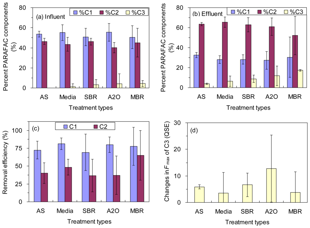 The Fmax of C1, C2 and C3 in the effluents were 42 ± 18, 89 ± 30, and 16 ± 17 QSE, respectively. Due to the different treatability of the wastewater treatment plants for each fluorescence component, the relative contribution of each PARAFAC component to the total fluorescence in the effluents was not the same (Figure 3a,b). Notably, %C1 decreased from 54% ± 8% to 28% ± 8% from the influent to the effluent, while %C2 increased from 43% ± 6% to 62% ± 9%. The %C3 showed net increase from 3% ± 7% to 10% ± 8%. As a result, fulvic-like fluorescence (C2) was the most dominant component in the effluents for all the wastewater treatments plants investigated. The protein-like components are commonly correlated to the bioavailability of DOC in aquatic environments [29] Therefore, our results suggest that the PARAFAC components may be effectively used to estimate the concentration of DOM as well as its bioavailability for all the types of the wastewater treatment plants. It is notable that the concentration and the bioavailability of the effluent DOM were higher than those of natural aquatic DOM that have been more frequently explored for the estimation using EEM-PARAFAC technique [7,16]. In addition, the influents of the wastewater treatment plants in this study were municipal sewage, thus the characteristics and treatability of DOM may be different for other types of wastewater such as industrial wastewater.