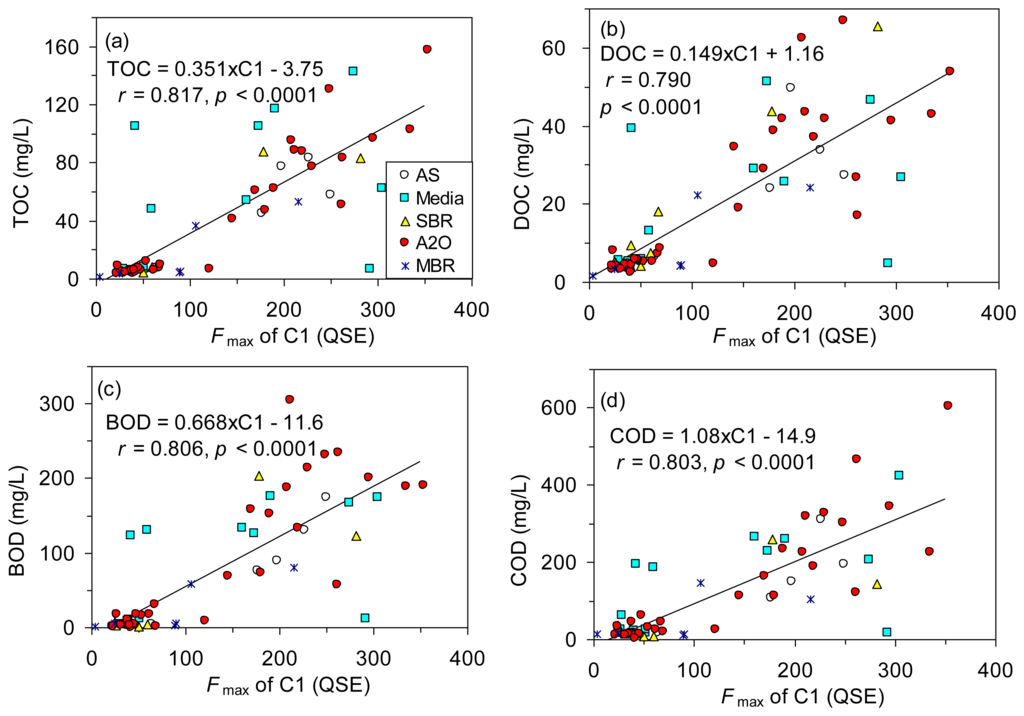 The inclusion of POC for this study notably enhanced the prediction capability of the Fmax of C1 for BOD and COD with r values increased from 0.803-0.806 to 0.886-0.896 (Table 3). The strong prediction (r = 0.958, p < 0.001) for TOC using the regression based on the Fmax of C1 and POC (r = 0.969, Table 3) was partially attributed to the fact that POC was calculated from TOC (i.e., TOC minus DOC) for this study.