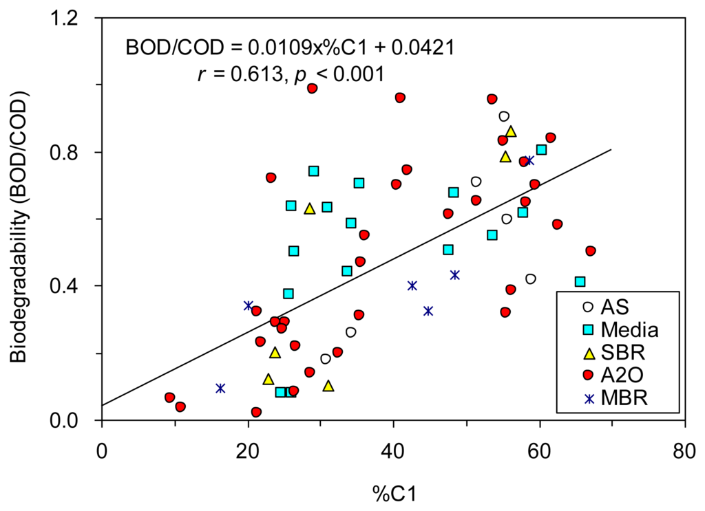 For this study, correlation analyses showed that BOD/COD correlated significantly (p < 0.001) with %C1, %C2, and %C3 (r = −0.568 to 0.613; ρ = −0.616 to 0.610), and the ratios of C2/C1, C3/C1 and C3/C2 (r = −0.419 to −0.598; ρ = −0.544 to −0.670) in this study (Table 4).