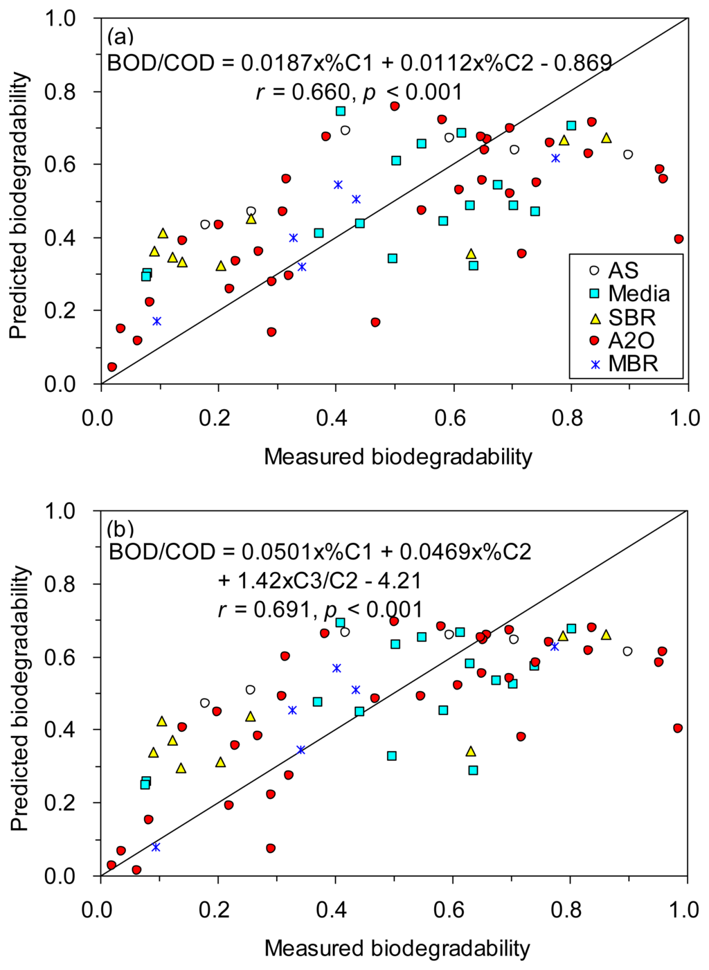 Encouraged by the significant correlations found between the six fluorescence component proxies and BOD/COD, we tested whether the prediction of biodegradability of TOC could be enhanced by using stepwise multiple regressions. Our results showed that the prediction was improved based on %C1 and %C2 (r = 0.660; Figure 6a), and based on %C1, %C2 and C3/C2 (r = 0.691; Figure 6b), as compared to based on %C1 alone (r = 0.613, Figure 5).