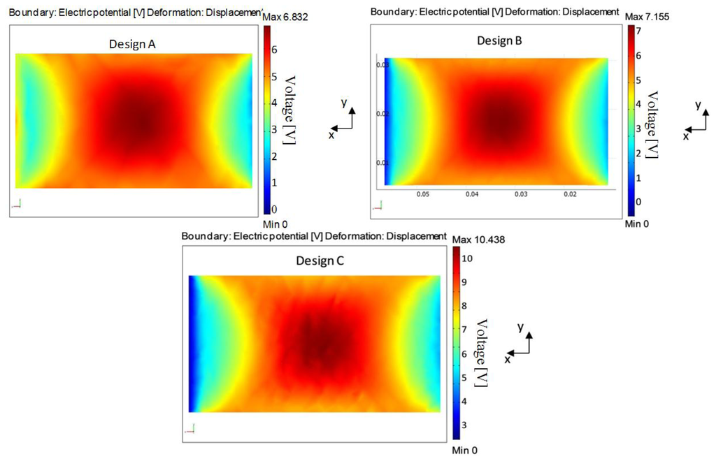 Simulation was carried out in two categories: static and modal analysis. The former includes the cantilever-DPT assembly stiffness and the voltage output of the harvester (Figure 16). The latter determines the cantilever-DPT natural frequency. The three cantilever designs were considered in both analyses. A summary of the main results found in these simulations are shown in Table 4.
