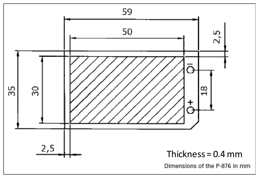This section presents the main features of the DPT transducer used in this study (see Figure 1). The reason behind choosing this transducer is its high charge coefficient d33 (394 pC/N), high mechanical strength and flexibility, and wide operation temperature range (−20 to 150 °C), making it well suited for energy harvesting within a tyre environment. The main dimensions of the transducer are shown in Figure 2.