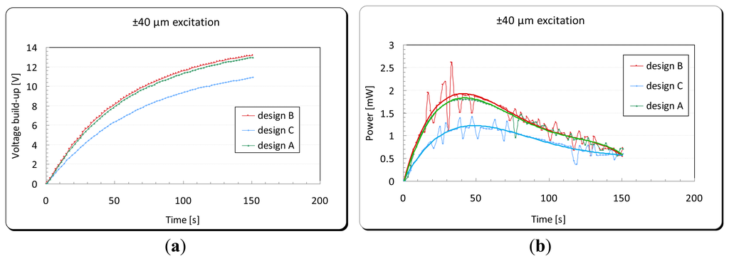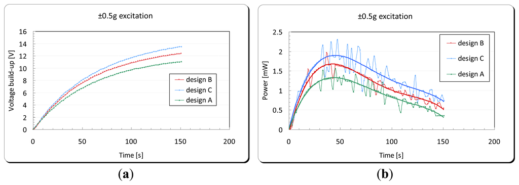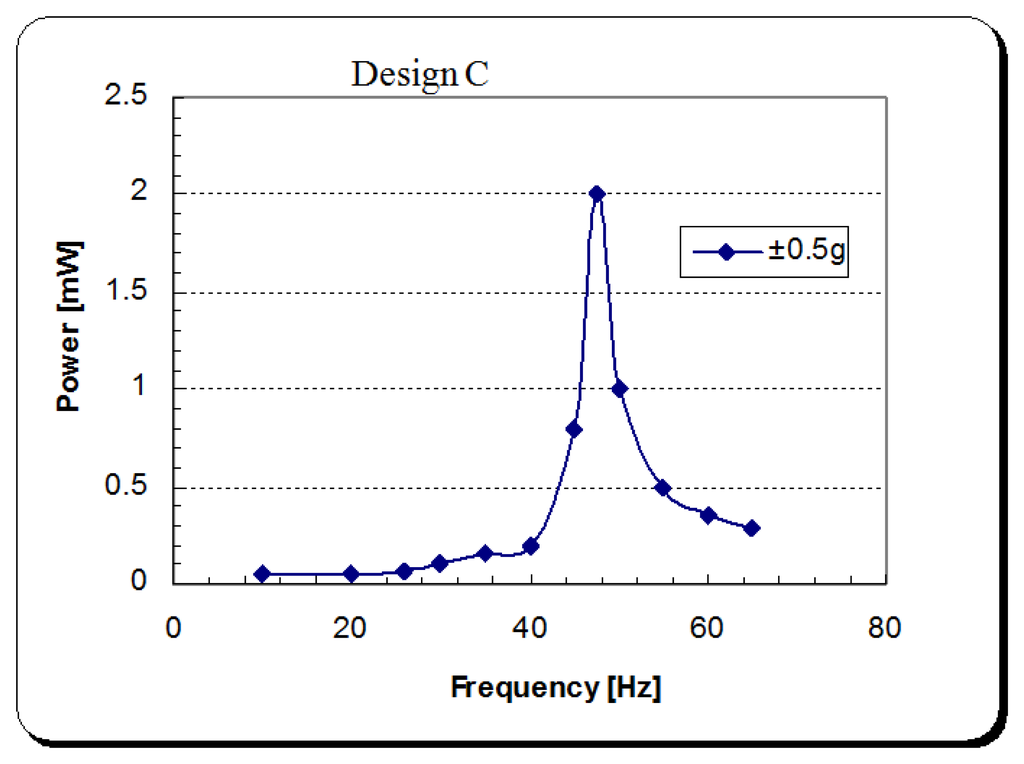 Experimental tests, using the apparatus shown in Figure 18, were carried out in order to examine the energy harvesting level obtained in each of the three designs. A full wave rectifier was used in order to convert the generated energy from the DPT from an AC to DC signal. This energy was subsequently stored in a 2,200 μF capacitor (see Figure 13). Each design was excited from the cantilever base by its fundamental structural resonance frequency first with a peak acceleration of ±0.5 g, and then with a ±40 μm amplitude of excitation. The voltage built-up in the storage capacitor and the corresponding generated power by the energy harvester are shown in Figures 21 and 22, respectively. For the energy harvester containing the design C cantilever and undergoing ±0.5 g acceleration of excitation, the output power as a function of excitation frequency is shown in Figure 23.