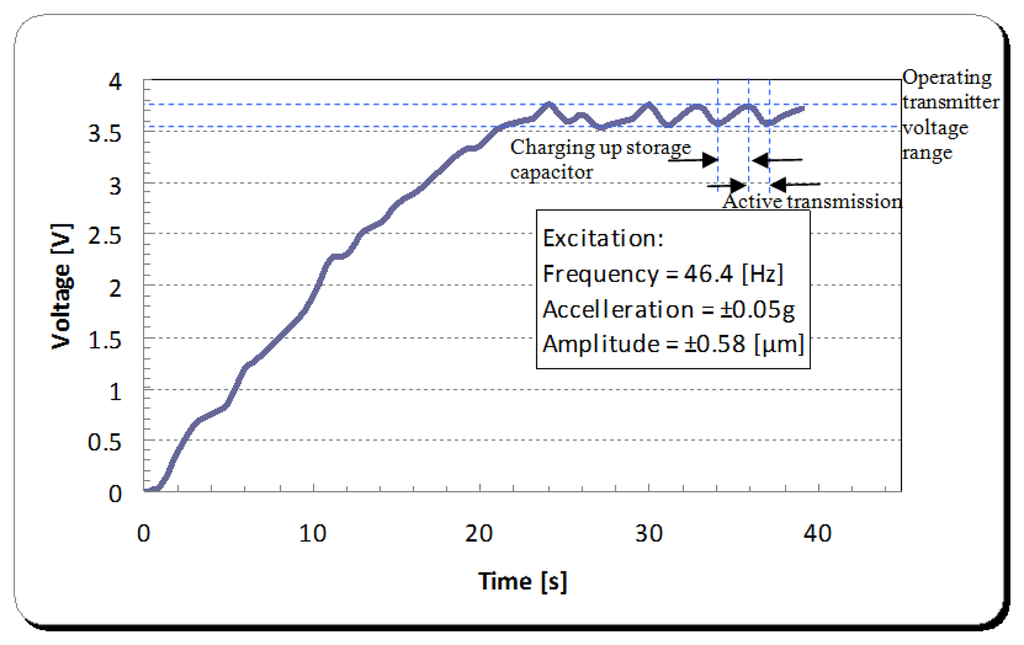 The PCB layout of the integrated power management unit with the λ oscillator/transmitter is shown in Figure 25. Given the tangential acceleration component inside a rolling pneumatic tyre shown in Figure 26 [16], the developed energy harvester was tested at a low level of acceleration excitation at resonance. The available shaker was capable of delivering as low as ±0.05 g of excitation acceleration, which is within the excitation range occurring in a rolling wheel as presented in Figure 26, and thereby the system was tested at that acceleration level to approach vibration conditions within a rolling pneumatic tyre as much as possible. Acceleration data were gathered by affixing an accelerometer on an R13 rim inside tyre cavity. The transmitted signal is a frequency signal, meaning that the RF frequency of the received signal is driven by the vale of the capacitance in the capacitive sensor. The conducted results at steady state charging-discharging cycle (Figures 27 and 28) showed an average sampling rate of approximately 0.166% (9.95 sample/min). The switching voltage range, bordered using two blue dashed lines in Figures 27 and 28, was chosen to ensure a reasonable balance between the transmitter/oscillator power consumption and the amount of the generated power by the energy harvester.