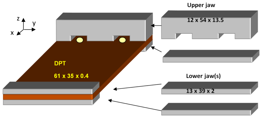 In order not to damage the electrical contacts of the DPT transducer, a couple of custom made jaws were used as shown in Figure 3. The experimental tests which were carried out examined the piezoelectric effect and Young's modulus of elasticity of the transducer at different force-rates along the x-axis, as shown in Figures 4 and 5, respectively.