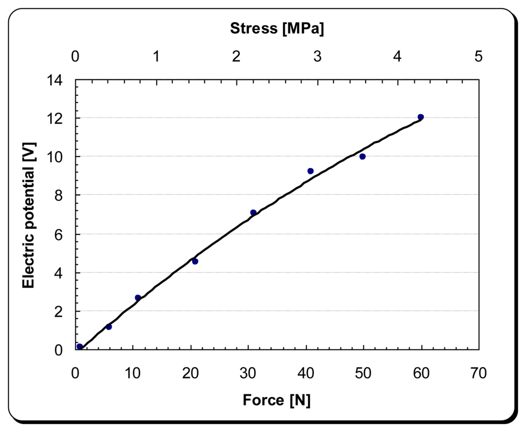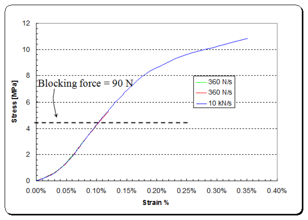 Non-linearity is a fundamental behavior in piezoelectric materials [30]. Figure 5 shows non-linearity in the stress-strain curve. This could be also due to the laminated structure of the patch transducer which consists of a piezoceramic plate, electrodes and preloaded polymer materials acting as mechanical preload and also as electrical insulation, making the DuraAct bendable [31]. The blocking force can be defined as the force required for pushing back a fully energized actuator to zero displacement.