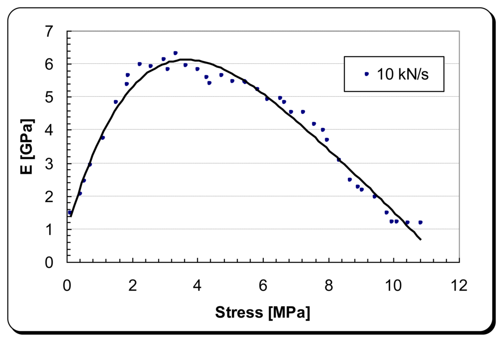 Figure 5 shows that the DPT transducer has a hyperelastic stress-strain relationship in the x-direction. This results in a variable modulus of elasticity for the DPT transducer, depending on how much tensile stress is being applied as shown in Figure 6. Modulus of elasticity experimental data were fed into the FEA modelling.