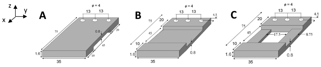 Figure 8 shows the three evolutionary steps, (designs A, B and C), which the optimized design underwent; starting from a simple cantilever design, going through an air-spaced cantilever, and ending up with an optimized air-spaced geometry with a boosted power density level. The same proof mass (47 g) is used in all designs, and all geometries are contained in the same space envelope (see Figure 7). Dimensions were chosen to achieve high deflection in the DFT but also within the fatigue limits of the cantilever assembly.