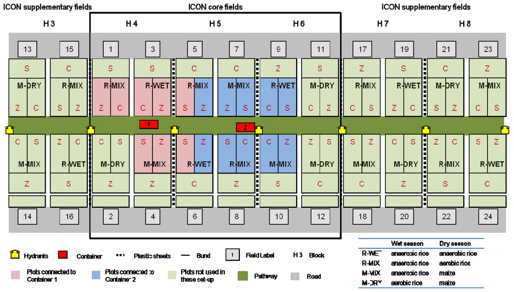 The experiment was planned as an extended Before-After Control-Impact Design [27] with time schedule and randomized block design. During the “Before” phase all fields were equally managed as flooded rice. As “Impacts” in the “After” phase the crop rotations R-MIX (flooded rice–dry rice), M-MIX (flooded rice–maize) and M-DRY (dry rice–maize) were established. As a “Control” in the BACI design R-WET (rice flooded–rice flooded) was continued. Each field includes plots with conventional, site-specific and zero nitrogen fertilization. The experiment design contains a systematic triplication of the experiment fields. A total of twelve fields (IRRI blocks H4-H6) with 36 plots were included in the core sample design (Figure 1). The field sizes are between 530 and 550 m2 and the plot sizes vary between 160 and 167 m2. Supplementary fields (blocks H3, H7, H8) were included for destructive field sampling. Irrigation water was supplied by a hydrant system located in block H1 with block H2 as a buffer zone between the water reservoir and fields. The total area used for the core and supplementary fields (without buffer zone) is about 150 × 100 m. Analytical instruments were housed in two containers on the path between the core fields.