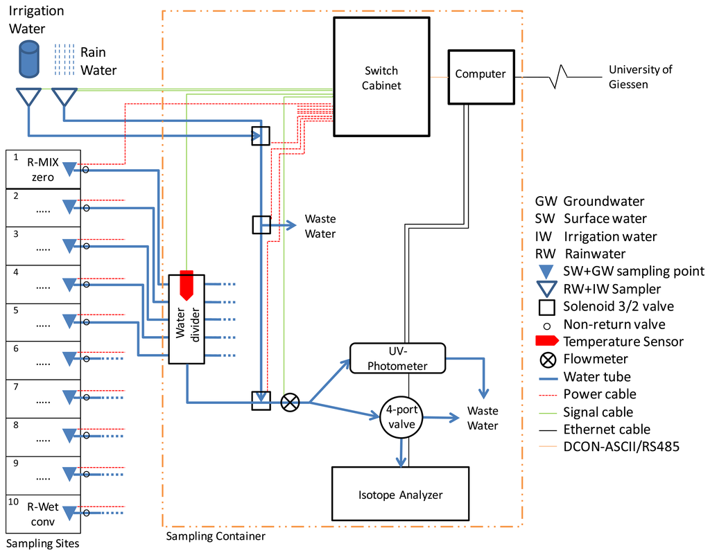 Challenges in this experimental setup include enabling automatic sampling of water of different sources (surface, ground, rain and irrigation water) and transporting these samples a rather long distance to the analytical equipment for direct analysis in two containers (Figure 2). We therefore constructed a sampling system consisting of 18 sampling points for groundwater (GW) and surface water (SW), additional sampling points for irrigation water (IW) and rain water (RW), a water transport and distribution system including a remote-control computer, a switch cabinet and several analytical devices.