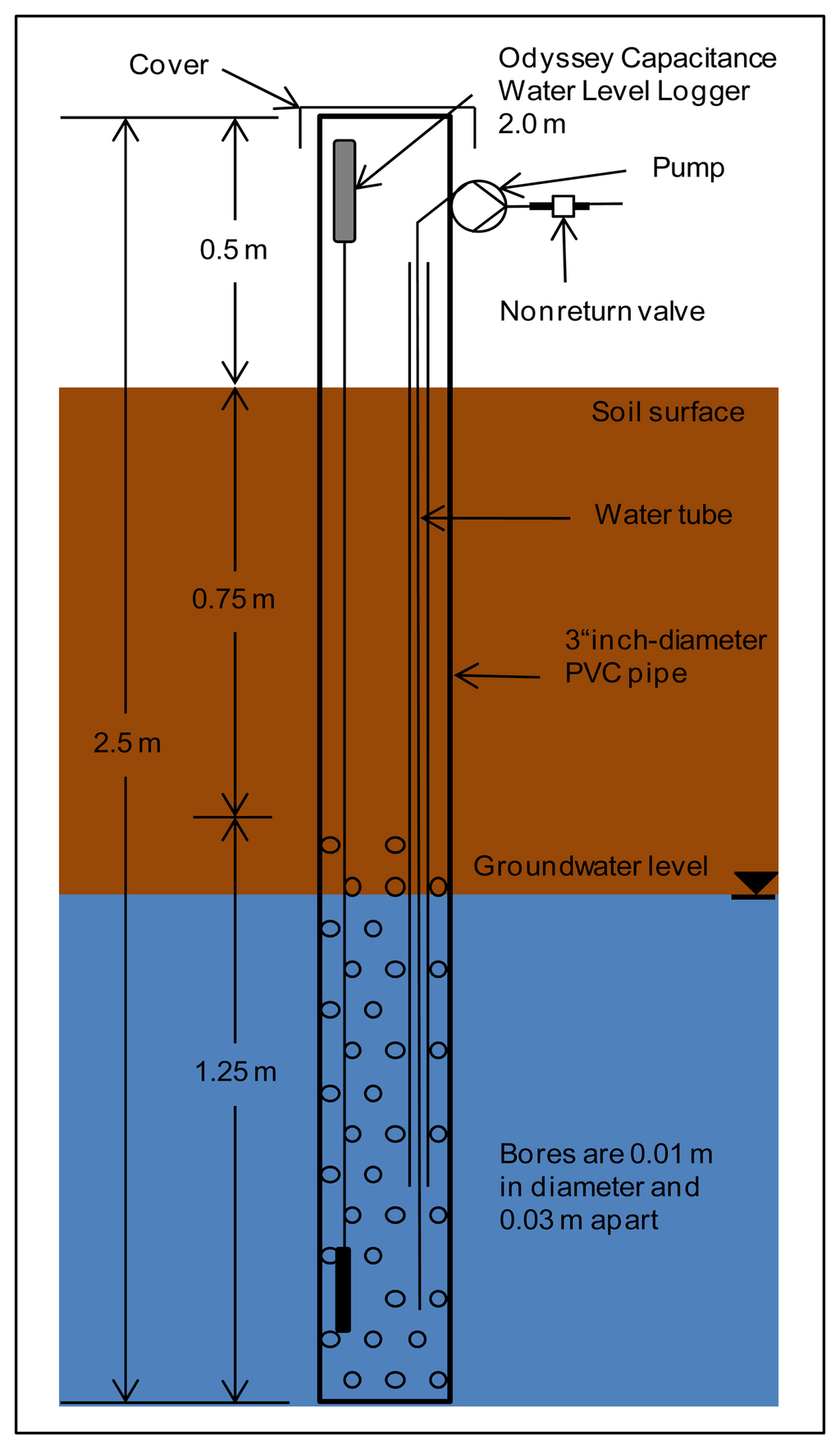 Two types of water sampling stations were constructed, one for SW sampling and the other for GW. The SW sampling points (Figure 3) are made of common 4″ PVC pipe with a length of 0.9 m, perforated with 0.01 m holes, spaced 0.03 m apart, over a length of 0.25 m starting 0.15 m from the bottom of the pipe. The GW sampling points (Figure 4) consist of common 3″ PVC pipe of length 2.5 m, with the same perforation as above, over 1.25 m, starting at the bottom. The top and bottom of the pipes were closed with caps to prevent transpiration and contamination. The perforations were wrapped with jute cloth to prevent clogging by soil sediment. The SW sampling stations were installed 0.2 m deep in the soil to measure standing water in the fields. The GW sampling stations were installed upright with the bottom 2 m below ground. The space between GW sampling stations and soil was filled with gravel (approximately 0.5 m below ground) and sealed with clay.
