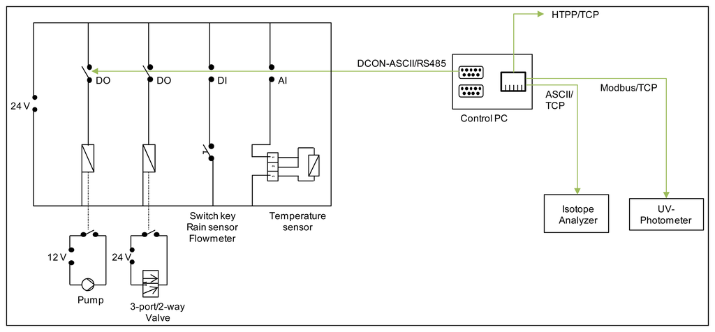 The valve/pump system is controlled in the switch cabinet using a serial connection over a RS232 port with the ASCII based DCON protocol. The DCON module of the software provides an interface for asynchronous communication using the DCON protocol using the python package “serial”. The I/O modules, digital in- and outputs and analogue temperature input are available as software elements for the other modules. The interface provides classes as relays, counters (for rain gauges and flowmeters) and temperature sensors used by the sampling sequence module. A MODBUS-TCP connection is used for triggering measurements and retrieving measured data from the UV photometer. The core functionality is wrapped by a specialized module using the “pymodbus” package.