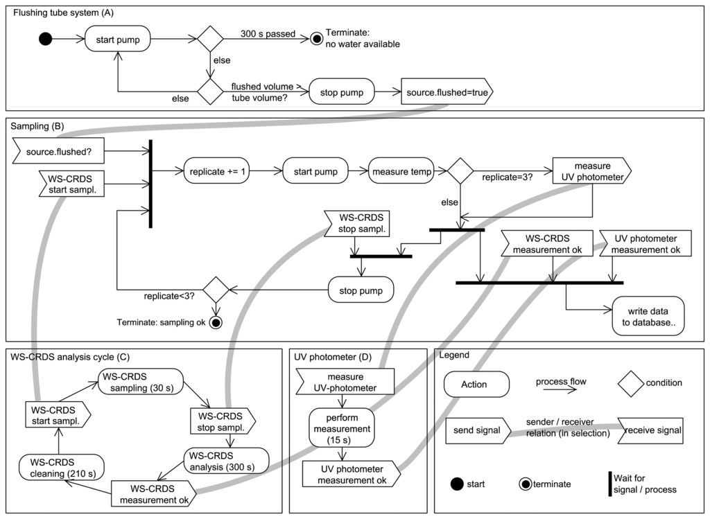 The whole system is controlled by software developed in-house for this study, running on an industry PC (NISE 101, SEPCTRA, Reutlingen, Germany) with the Xubuntu operating system. The controlling software is written in Python as an object-oriented, asynchronous and modular framework using various open source Python packages from the Python package index [30]. As such, the software is portable to different platforms and available on request from the authors under an open source license agreement. The self-developed modules are responsible for the scheduling of sampling, communication with the valve/pump system and the analytic devices using several bus systems, protocols and a web server to serve as the user interface.