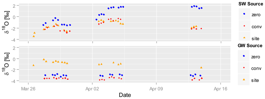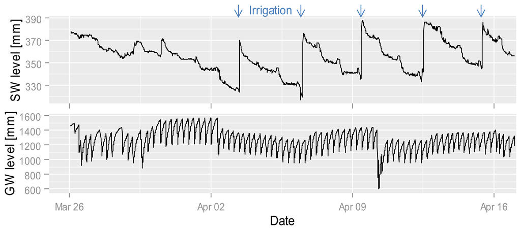 Figure 7 shows automatically recorded δ18O values in the SW (top) and GW water (bottom) between end of March and mid April 2012 (dry season, 58 to 76 days after seeding) for selected plots. Gaps in the graph are due to setup changes and system testing. The δ18O values in the SW plots increase from 26 March on, starting at −3‰ and reaching almost −1‰ on conventional as well as site-specific plots, and from −2‰ to 0‰ on zero-fertilized plots. A sharp drop on 28 March occurs on all sites; δ18O values then steadily increase until 5 April. While δ18O values in the zero-fertilized plots stay at the same level of 2‰ until 14 April, they fall back to the base level in the conventional and site-specific fertilized plots. We speculate that the richer δ18O signatures in the SW of zero-fertilization plots are related to less shading by plants due to weaker plant growth and stronger evaporation. The other two fertilized plots show stronger plant growth and higher shading and are therefore less enriched. Contrastingly, δ18O signatures in the GW stay relatively constant the whole time (site-specific 0‰–1‰, conventional −3.5‰, zero −3‰), indicating no direct interaction between SW and GW during this period of time. The value of the high frequency, in situ sampling system is depicted by the detailed record of the changes in δ18O in SW—a dynamic that would not have been captured by conventional, less frequent grab sampling.