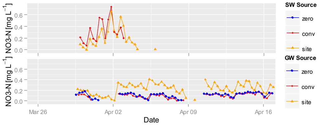 Nitrate values in the GW are almost always greater than the detection limit. The nitrate concentration in the site-specific fertilized GW is higher than the concentration under the conventional and zero-fertilized plots. The two time points (2 and 10 April) with the highest nitrate increases (despite the data gap before the 10th) in the site-specific fertilized GW plot are related to a drop in the GW level (Figure 9). The increase at this point could be caused by the onset of aerobic conditions in normally saturated soil, nitrification and transformation into the GW, whereas the first drop in GW levels is during drier conditions than the second (Figure 9). It is possible that the GW is mainly affected by soil conditions and GW flow direction so that under all plots nearly the same nitrate concentrations exist. It seems that GW is less affected by surface events, whereas high-frequency measurements enable capturing and comparing short-term differences which allow to develop hypotheses for underlying processes.