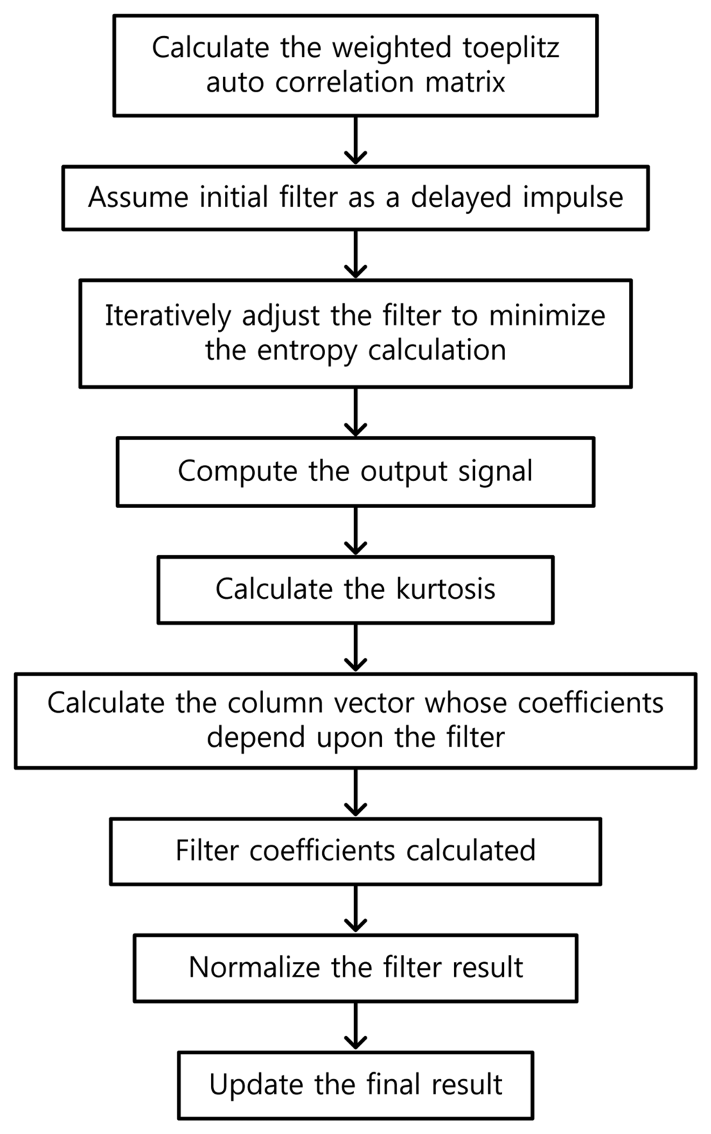 As depicted above, the MED algorithm minimizes the entropy of an arbitrary input signal through the deconvolution process, so that the kurtosis of the signal can be maximized. Figure 1 illustrates the conceptual flowchart of MED. In this study, MED will be utilized to detect the bearing faults, in conjunction with kurtosis optimization.
