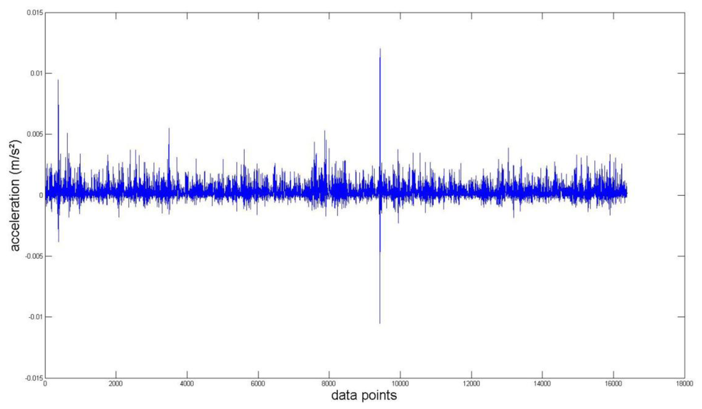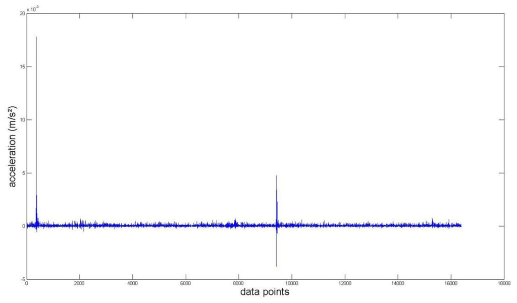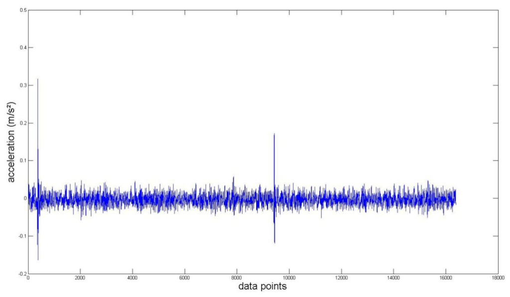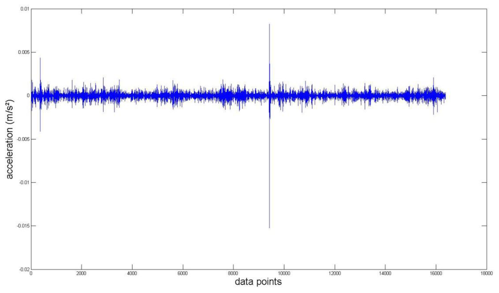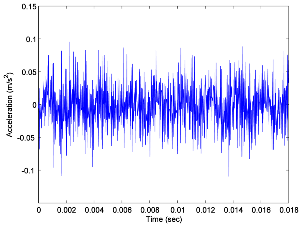 Again, we measured the vibration signals from accelerometers mounted on the top of the bearing housing. Signals from the bearing with and without defect are compared, for verifying the fault detection methods. Figures 5 and 6 depict segments of acceleration measurements from healthy (H1) and damaged (D1) bearings, respectively. The segment is composed of vibration signals having 214 data points (50 kHz sampling frequency), and we applied algorithms of MED and the TKEO on the segment. In total, five cases are considered; Case I for the original signal, Case II for only MED, and Case III for only the TKEO. We also connected two algorithms in series for Case IV, and switched the sequence for Case V (see Table 1). After that, the kurtosis values of the segment from two healthy and four damaged bearings are calculated. Here, we would be able to compare the performance of each algorithm for monitoring the defect in bearings. Figure 11 illustrates the kurtosis values of healthy (H1, H2) and damaged (D1–D4) bearings, for all five cases (Cases I–V).