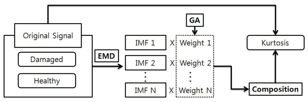 Figure 12 explains the schematics of EMD-GA that amplifies the kurtosis level, by optimally adjusting the weight of individual IMFs. In order to verify the performance of the EMD-GA approach, segments of signals from both healthy and damaged bearings are decomposed into IMFs. The GA seeks for the optimal weights of the IMF. Here, the objective function to be minimized becomes the negative kurtosis value of the reconstructed segment, when all the IMFs with weights are summed. Apparently, the design variables are elements of the weight vector for each IMF. Having converged IMF weights, we compared the kurtosis of the reconstructed segment from the healthy and damaged bearings. Thus, it becomes possible to increase the contrast of kurtosis between the healthy and damaged bearing signals, after performing EMD-GA.