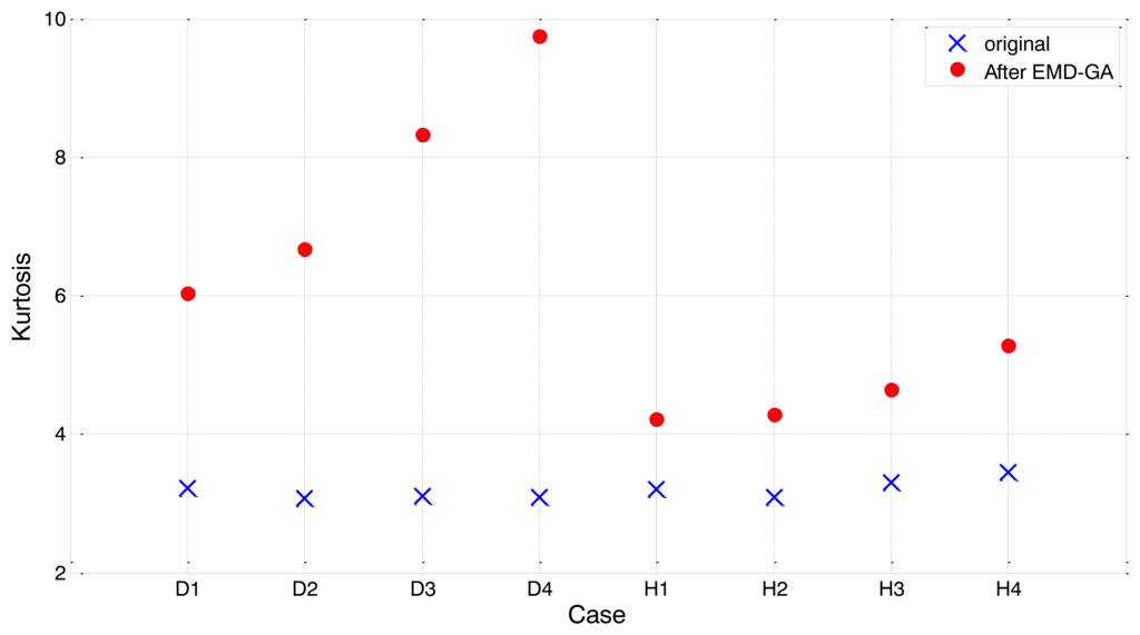 Figure 14 shows the comparison of kurtosis between the original segment and the EMD-GA employed one. As shown in the figure, kurtosis values of the bearing signal segments are not much different in the beginning, for both healthy and damaged bearings. After EMD-GA operation to optimize the weights of individual IMFs, the kurtosis for damaged segment (D1–D4) increases from twice to three times higher than the original. Such an enhancement is quite noticeable, compared to kurtosis variation of a healthy segment (H1), which is around 40%. It should also be noted that the kurtosis values of damaged segments exhibit a relatively large scattering, compared to the original ones. For example, the effect of contrast enhancement for D1 appears much smaller than other segments, such as D3 and D4. Because the severity of defect is unique for each bearing unit, the performance of EMD-GA could be inconsistent for other damaged segments. Again, the gap of kurtosis value between the healthy and damaged bearings is not obvious, as we have seen from Figure 14. This indicates that the kurtosis per se does not effectively identify the presence of defect in a bearing. Thus, the performance of condition monitoring towards the early stage of bearing defects can be improved by exploiting the EMD-GA.