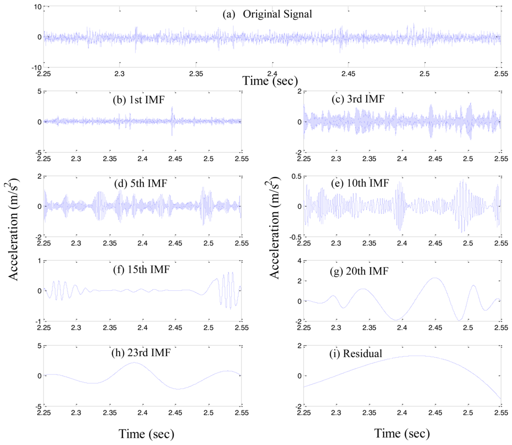 Thus, we found n number of empirical modes, and the residual component rn. Here, rn represents the mean trend of x(t). The individual IMF, i.e., c1, c2, …, cn covers a broad range of the frequency band, from the highest to the lowest. Figure 2 illustrates an example of the EMD process, where Figure 2a shows the original signal, and Figures 2b–i depict the decomposed seven IMFs, and the residual.