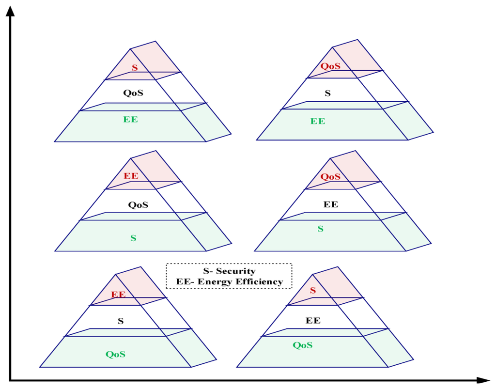 From the pyramid view of Figure 3, we can easily notice the self contradicting nature of the three areas of a wireless sensor network in three layers. In the lowest two pyramid view, it is clear that if we want to ensure high amount of QoS then eventually the other two parameters will be affected. In the middle pyramids we can see the same scenario with security as the most important issue. Like the previous one, here QoS and energy needs to be compromised. In the upper two pyramids energy efficiency is the most prioritized issue, so QoS and security parameters are highly compromised.