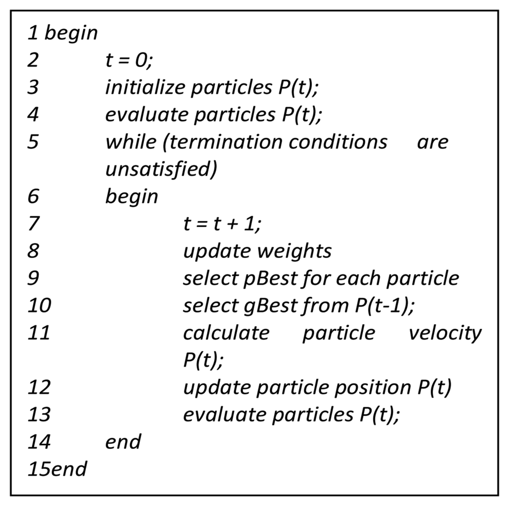 Generating particles' position and velocities, velocity update, and position update- these three main steps defines the PSO algorithm. Here particle refers to a point in a D-dimensional search space that updates its position from one point to another based on related velocity updates. The i-th individual (particle) of the population, which is called swarm, can be represented in a D-dimensional vector as, Xi =(xi1, xi2,…, xiD). The velocity or the position change for particle i is represented as Vi =(vi1, vi2,…, viD) and the best previously visited position of this particle is denoted as Pi =(pi1, pi2,…, piD). Symbol g represents the best particle in the swarm and w is the inertia weight. The particles are then manipulated according to the following two equations [37]: