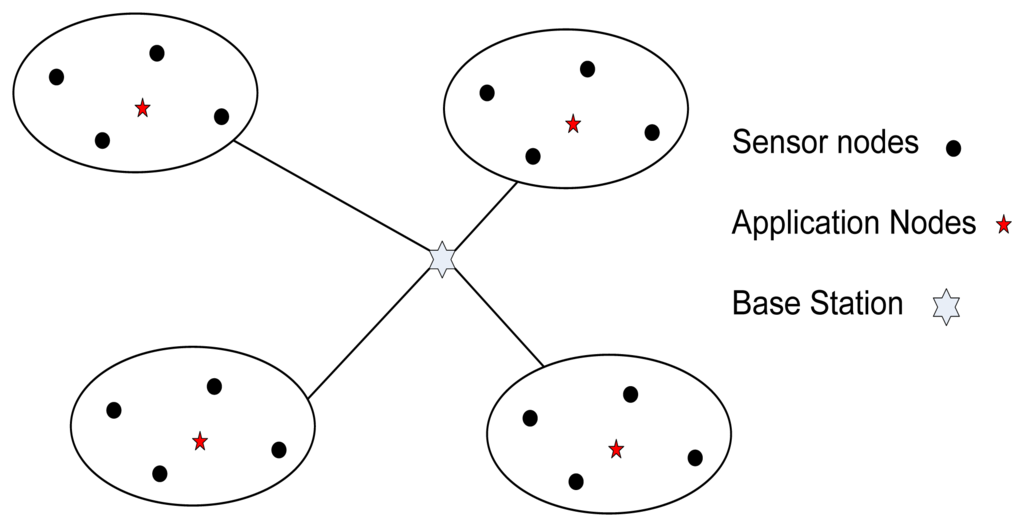 Base Station Positioning is another important factor for designing WSNs. The base station is usually assumed to have unlimited energy and powerful processing capability. In [47], a two-tiered wireless sensor network has been considered (see Figure 5) and an algorithm based on particle swarm optimization (PSO) has been proposed for finding the multiple base stations. The two tier network consists of nodes that can communicate only with the application nodes they are assigned to. Application nodes possess long-range transmitters, high-speed processors, and abundant energy. This method aims at determining positions of base stations so that the total of distances of application nodes to their nearest base stations is minimum. This deployment requires minimum transmission power and assures maximum network life.