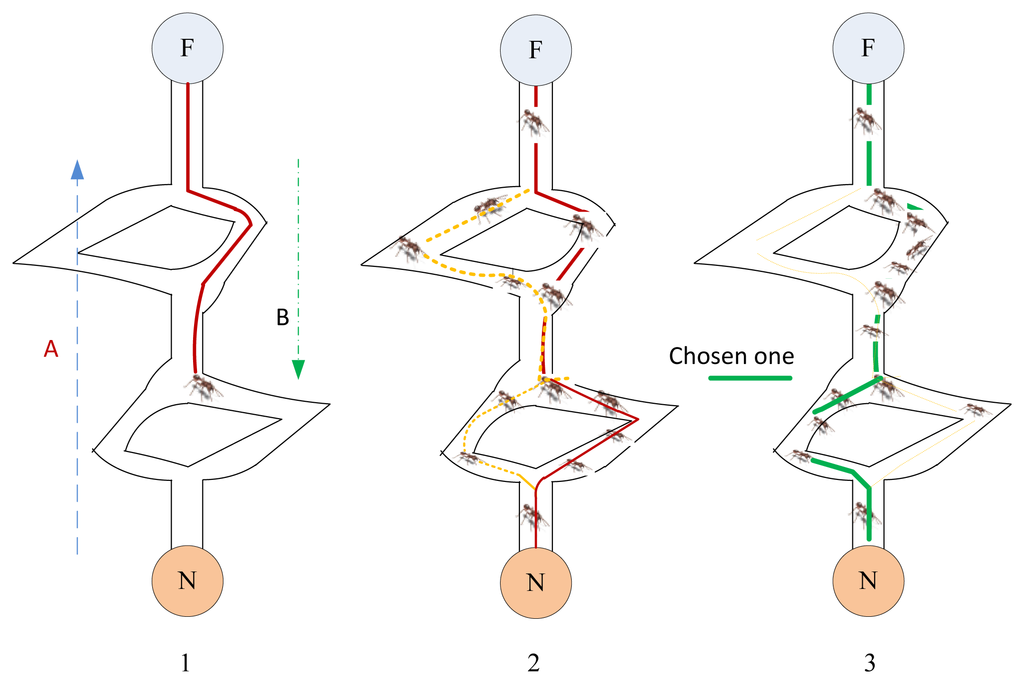 For example if there two paths A and B exist between a nest and a food source (see Figure 6), and nA(t) and nB(t) are the number of ants use them at time step t, respectively, then the probability of ant choosing path A (PA), at the time step t + 1 is given by the following equation: