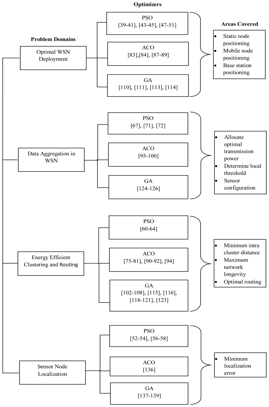 Thus, bio-mimetic optimization algorithms with some degree (low or medium) of computational complexity are worth exploring. Conventional or classical optimization algorithms are power hungry approaches. They must be restructured to reduce code size and dynamic memory usage due to the limited memory capacity of WSN nodes—typically less than 50 KB for code memory and even less for data memory. Recently, researchers have addressed these challenges by adopting bio-mimetic optimization strategies along with conventional techniques. There exists a diverse range of bio-mimetic or metaheuristic algorithms for optimization in wireless sensor networks including Particle Swarm Optimization (PSO), Genetic Algorithm (GA), Ant Colony Optimization (ACO), etc. In fact, optimization algorithms are far more diverse than the types of optimization, but the right choice of an optimization algorithm can be crucially important in finding the right solutions for a given optimization scenario.