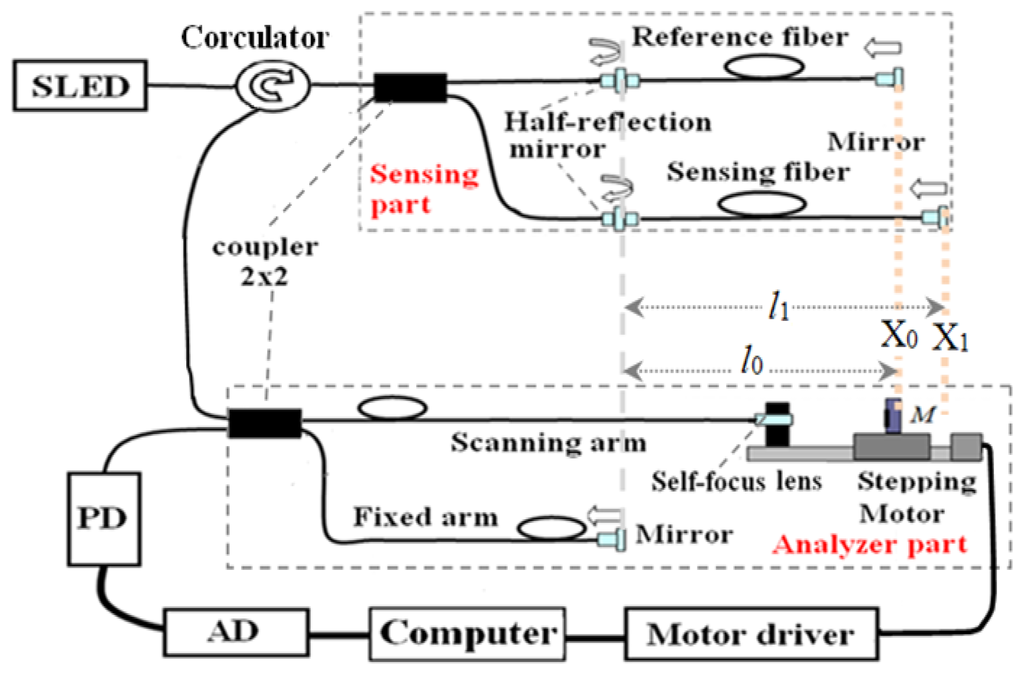 The LCFS system is utilized for the measurement of steel corrosion expansion in concrete as shown in Figure 1. This principle, in order to get rid of the fluctuation of the introduction fiber by introducing an analyzer part, was firstly proposed in [10] and thenused in the practical tests [9,11]. Here we changed the coupler into a circulator and improved the system performance by using a reference fiber. The light comes from a super-luminescent emitting diode (SLED) source, with a center wavelength of 1,310 nm and a bandwidth of 45 nm, through a circulator coupled into two arms of a 3 dB coupler. The light of one arm is transmitted through a half-reflection mirror to a reference fiber and reflected by a mirror. The light of the other arm is also transmitted through a half-reflection mirror to the sensing fiber and reflected by a mirror. The light reflected by the half mirror and the mirror in both the reference and sensing fiber are coupled into the coupler again, and then through the circulator connected to a 3 dB 2 × 2 coupler. The light of one arm is transformed into a parallel light by a self-focusing lens, projected to a scanning mirror moved by a stepping motor, and reflected back to the self-focusing lens. This forms the scanning arm of the LCFS. The light of another arm is reflected by a mirror through a fiber in a specific length and forms the fixed arm of the LCFS. Finally, the signals in the two arms are reflected, coupled to the 3 dB coupler, and passed through the two arms of the coupler. The signals can then be detected by a photodetector (PD). A data acquisition system (AD) is needed, which is connected by a computer. The fibers used to configure the schematic were Corning single mode fibers (SMF28) and the reference and sensing fibers were Corning SMF G657A/B optical fiber with an improved macrobend performance.