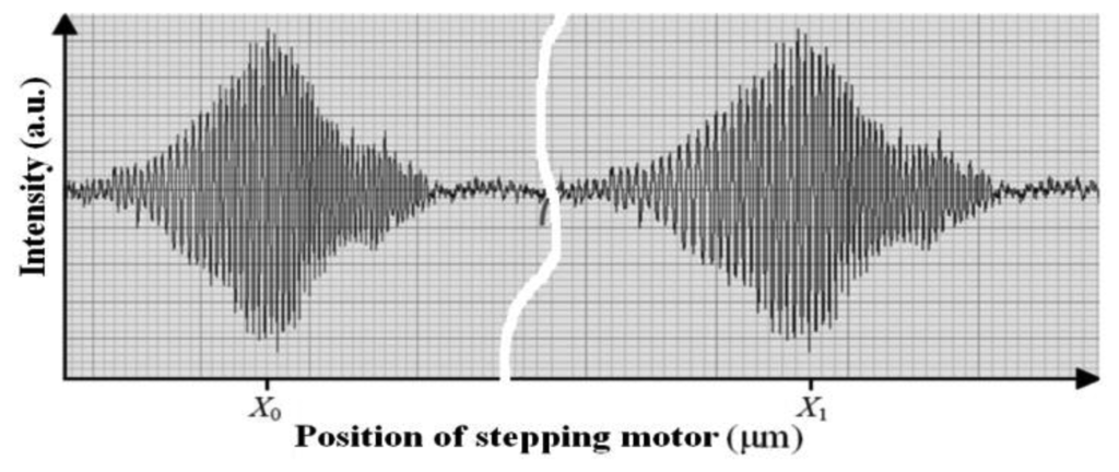 Thus, the lengths of the reference fiber and sensing fiber, l0 and l1, can be configured in one scan range of the stepping motor to meet the two equal optical paths condition. When moving the stepping motor, the optical path difference (OPD) between the scanning arm and the fixed arm in the analyzer part will sequentially meet the equivalent OPD determined by the reference fiber and sensing fiber, respectively, in the sensing part and two peaks of the interferograms are obtained at different positions, X0 and X1, as showed in Figure 2. The sensing fiber was wound around the steel rebar in a number of circles and the reference fiber applied in the same way on a separate rebar. The rebar with the reference fiber was not connected to the electrical current and thus it only acted as a compensation for the corrosion sensor, while the rebar with sensing fiber was corroded by an electrochemical corrosion acceleration experiment. When the corrosion expansion increased, the length of the fiber l1 will be elongated to l1′. Then the stepping motor position X1 must be moved to X1′ to meet the equal optical path length condition. Thus, by reading the stepping motor position X1′ one can measure the length of the sensing fiber that is determined mainly by the corrosion expansion and a little from any non-corrosion-expansion factors. On the other hand, the reference fiber will not be sensitive to the corrosion expansion, because the current is not applied through the rebar with the reference fiber. It only measures the contributions from the non-corrosion-expansion factors, such as temperature expansion, etc. Thus, most of the fluctuations in the sensing fiber can be reduced based on the measurements of the reference fiber. Finally, the span between the two positions ΔX0 = |X1 − X0| can be recorded as an initial state.