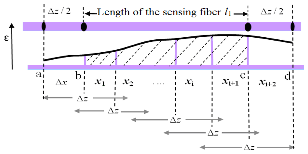 The methods developed to get rid of the limitations of the spatial resolution are an interesting topic [17–20]. Much progress has been reported in high-resolution, long-range schemes, by which Brillouin scattering-based technique was extended, such as random-access Brillouin sensors based on radar-inspired technique [21] and pre-pump Brillouin technique [22], etc. Here, we only directly considered the spatial resolution by an equivalent sensing fiber length l1 + Δz in Equation (2). Thus, a relationship between the total deformation, Δl, and the integral of the distributed strain measured by BOTDA, ε(x), can be set up as: