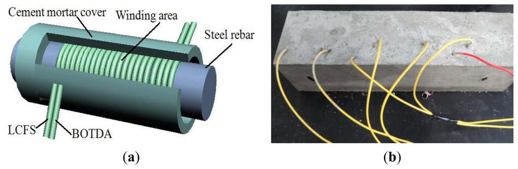 After being polished, the diameter of the steel rebar was 18 mm and the length was 18 cm. Two pieces of the Corning SMF G657A/B optical fibers, which have a minimum bending radius of 7.5 mm and in 3 meters length, were directly wound around the rebar in a number of circles next to each other, one for LCFS and the other for BOTDA, as shown in Figure 4a. The strain coefficient of the fiber was calibrated as 480 MHz/% strain [8]. About 9 mm-thick cement mortar cushion layer was coated to the steel rebar and formed a solidification pillar. The introduced fibers were armored for protection as shown in Figure 4b.